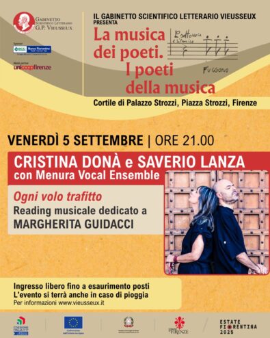 Cristina Donà e Saverio Lanza, con il concerto reading dal titolo “Ogni volo trafitto” e insieme al coro Menura Vocal Ensemble, dedicano il loro omaggio a Margherita Guidacci, poetessa e traduttrice fiorentina. “Ci ha colpito – spiegano i due artisti – una poetica quasi sempre narrativa, vicina a un racconto limpido, spesso chirurgico della realtà, una direzione più simile a una cronaca dei fatti che a un esercizio di astrazione, che rivela la ferma volontà di comunicare con chiarezza. Sorprendente e toccante anche la denuncia sociale e civile espressa attraverso alcune opere, unitamente al suo voler farsi voce di tanti, mettendo in primo piano il “noi” anziché il proprio egoico “io”. Una poetessa profondamente immersa nella vita”.