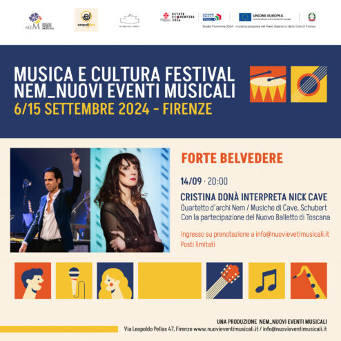Una nuova grande produzione Nem: le ballate più belle di Nick Cave interpretate da Cristina Donà con il Quartetto d’Archi Nem e Marco Bucci al pianoforte. A concludere il programma il quartetto d’archi con La Morte e la Fanciulla di Schubert. Il Nuovo Balletto di Toscana conclude la produzione con interventi su alcune delle più belle musiche da film di Cave. Un vero grande evento di musica e arte.